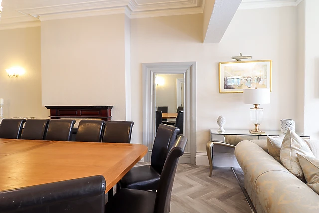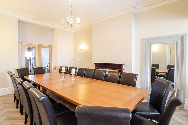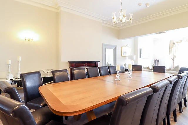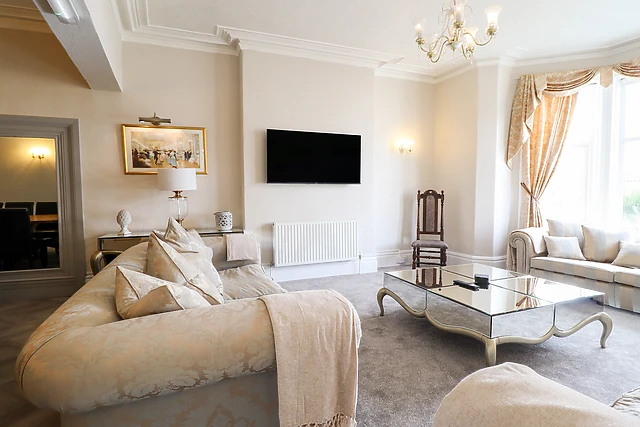 Down the corridor from the kitchen is a lovely, well-presented living/dining room, a great spot for savouring your dinners together, enjoying family game nights, or even indulging in a movie marathon on the sleek, wall-mounted Smart TV! When the sun sets, head up to the first and second floors to catch your valuable slumber in one of the eight bedrooms on offer, seven of which comprise double beds, and all of which are accompanied by their very own en-suite bath or shower rooms.