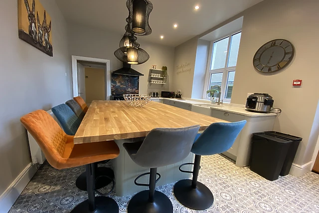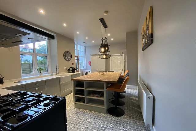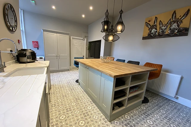 Enter your impressive new home-from-home, which boasts elegant interiors set over three floors. On the ground floor, you’ll find a fully-equipped kitchen, housing all the essentials the budding chef will need to whip up a feast to feed the whole group and a dishwasher to help with the clean up!