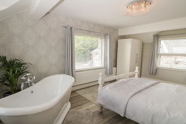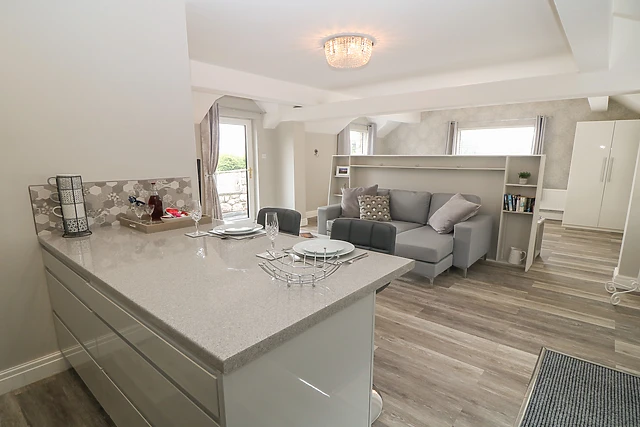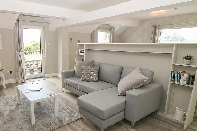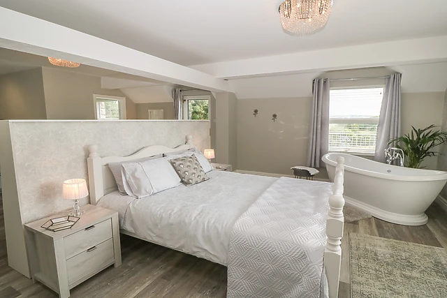 The accommodation is all on one level, with a spacious open-plan living area that includes a king-size double bed and a freestanding bath, offering a touch of indulgence.