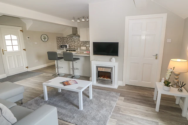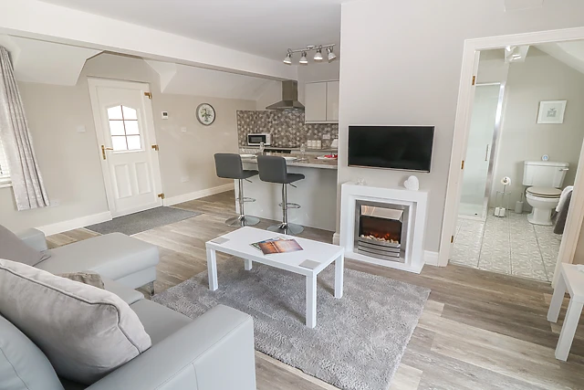The living space is complemented by an electric fire, creating a warm and inviting atmosphere.