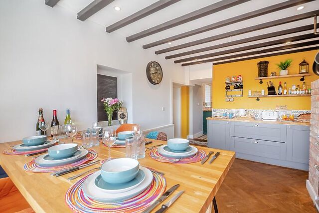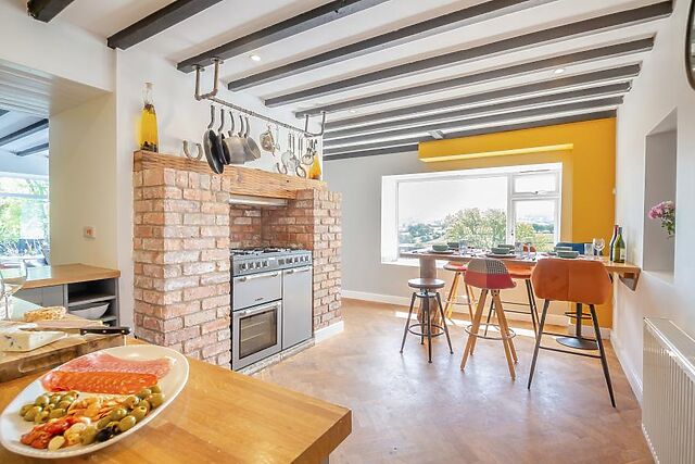 Calming tones and rustic touches are complemented by vibrant pops of colour and thoughtfully chosen artworks. The open-plan kitchen and dining area invite sociable meals with a large range oven in the fireplace and a high table by the window so you can savour countryside views with every meal.