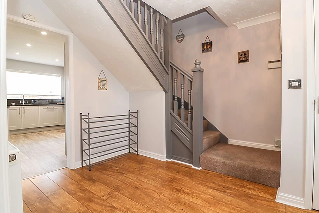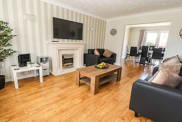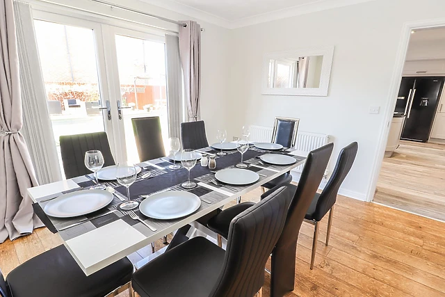 Enter the property to find a beautifully appointed living/dining room, where a sitting area features stylish, leather sofas; here, you can also enjoy your favourite show on the Smart TV or simply sit back with your favourite evening tipple whilst the little ones play a game on the Playstation 3. Through the archway is the dining area, where a sleek dining table seats up to eight guests, so all the family can enjoy a meal together at the end of the day.