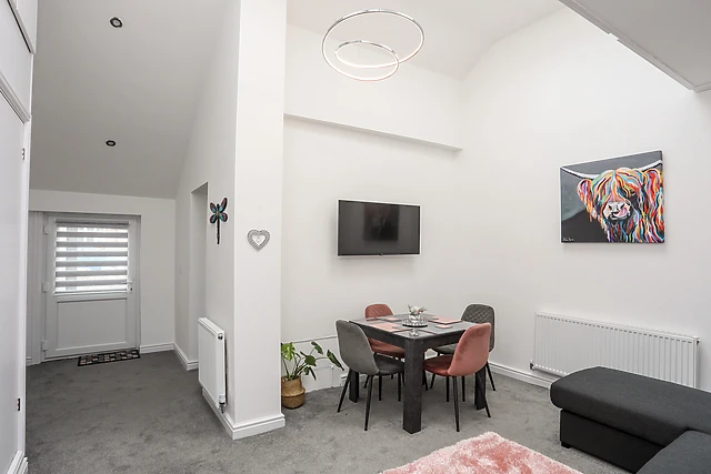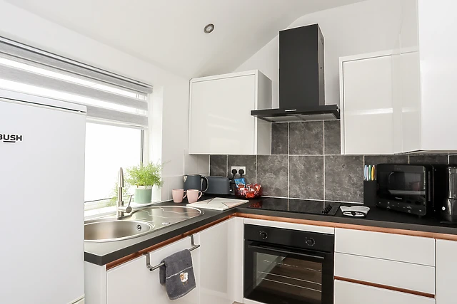 The modern shower room adds a touch of elegance to your stay. The open-plan living and dining area provides a cosy space to unwind, with a well-equipped kitchen for home-cooked meals.