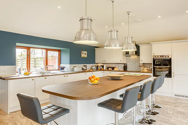 The property's spacious kitchen area, complete with floor-to-ceiling windows, provides a sociable space for cooking and dining while admiring the garden and mountainous vistas.
