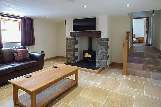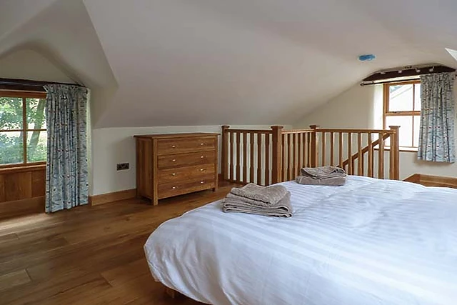 To the left, four steps lead down off the hall into the cosy sitting room which has both underfloor heating and an inglenook woodburner to warm your toes on a cold winterÂ’s evening. A staircase leads up to a double bedroom with a king-size bed and sloping roof which the children will love.