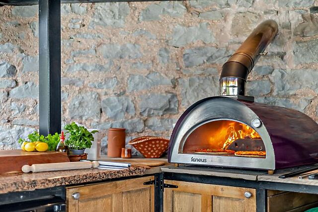The property features a fully equipped outdoor kitchen with a wood-fired oven, as well as a modern indoor kitchen with an electric oven, induction hob, and all the necessary appliances for a comfortable stay.