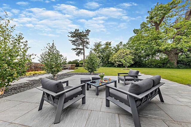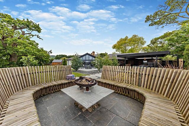 The cottage boasts an array of opulent features including a hot tub, sauna, and plunge pool, set within an enclosed garden that offers panoramic views of the surrounding landscape.
