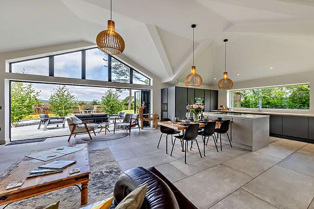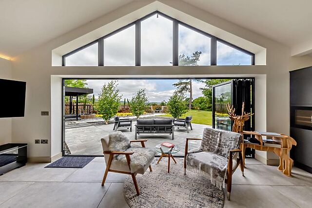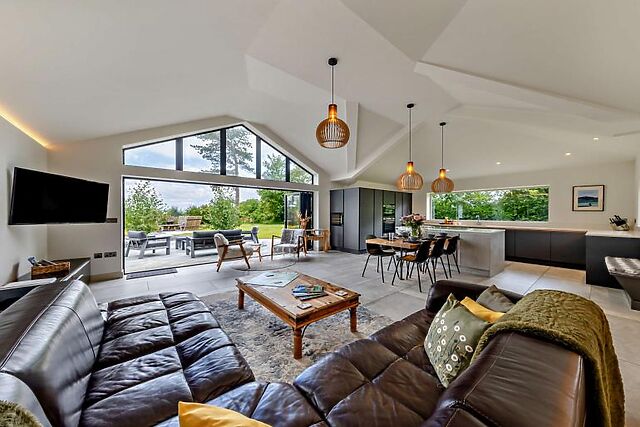 Inside, the open-plan living space is bathed in natural light, with bifold doors that open up to the garden, merging indoor elegance with the charm of the countryside. The fully equipped kitchen and underfloor heating add to the luxury, making it the perfect getaway for families, friends, and couples seeking a blend of relaxation and adventure.