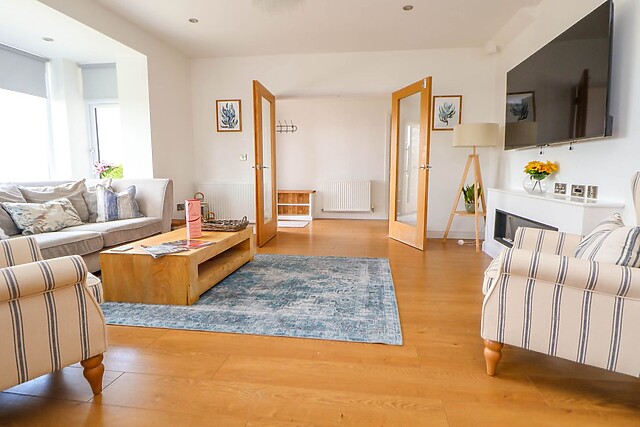 On the first floor, you will find a double bedroom featuring a large picture-style window with breathtaking views, a single bedroom, and a family room with a double bed and pull-out single sofa beds. The ground floor hosts a further double bedroom and a twin room, offering flexibility to suit all types of groups.