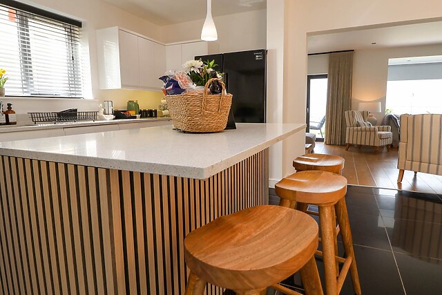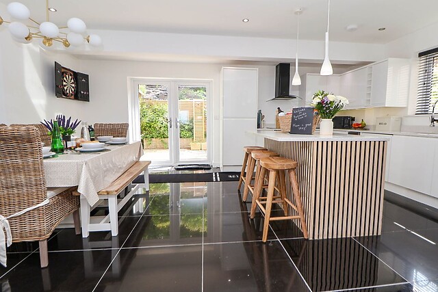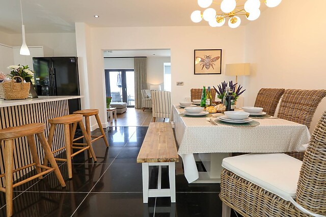 Upon entering the property, you will be greeted by a spacious open-plan area, housing a well-equipped kitchen for preparing your favourite meals. Adjacent to this, the dining area offers seating for up to ten guests, enjoy some pancakes at the breakfast bar or enjoy a large family feast at the dining table, perfect for hosting memorable family dinners.