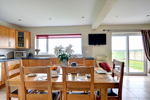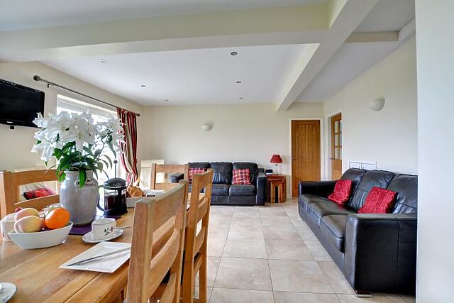 The cottage features three well-appointed bedrooms: a king-size with an en-suite shower room, a double, and a large room with two single beds and a bunk bed suitable for children. The open-plan living area includes a cosy lounge, a fully equipped kitchen, and a dining space, perfect for family meals and gatherings.