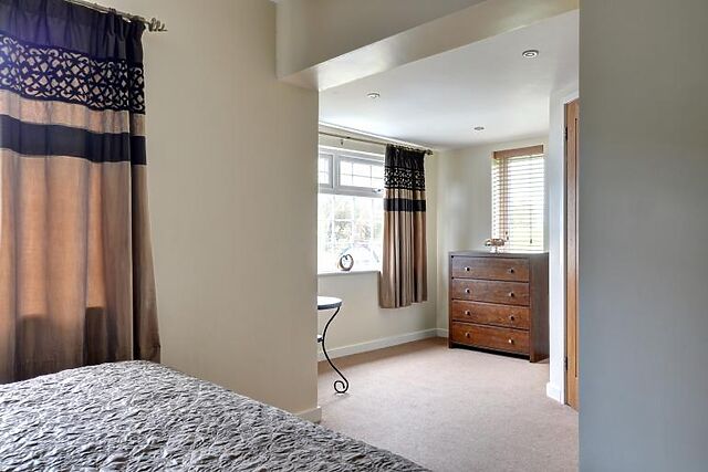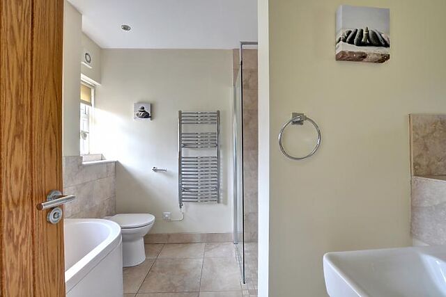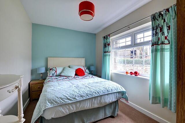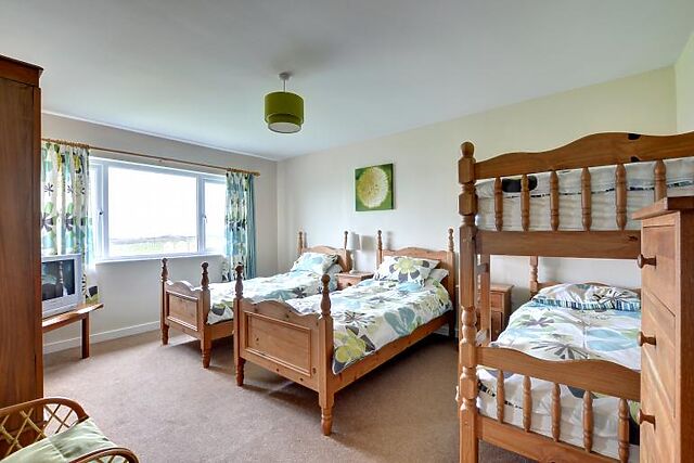 The cottage features three well-appointed bedrooms: a king-size with an en-suite shower room, a double, and a large room with two single beds and a bunk bed suitable for children.
