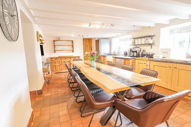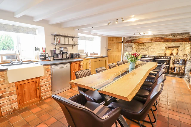 Step into the rustic kitchen/diner and be impressed with the incredible bespoke made dining table, created by a local craftsman from wood and glass, it features down the centre of the room offering a wonderful way to come together at mealtimes, surrounded by the classic slate worktops and tiled flooring, it boasts a traditional country feel. Set within what would have once been a huge inglenook fireplace, are two quality double ovens, cook up feasts using these appliances and the many others at your fingertips, with a utility room round the corner holding a second fridge/freezer, washing machine and a tumble dryer, as well as a fun football table, leading to the ground-floor shower room.