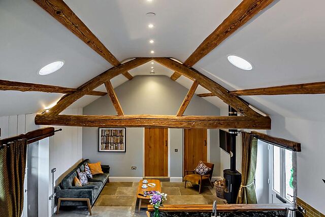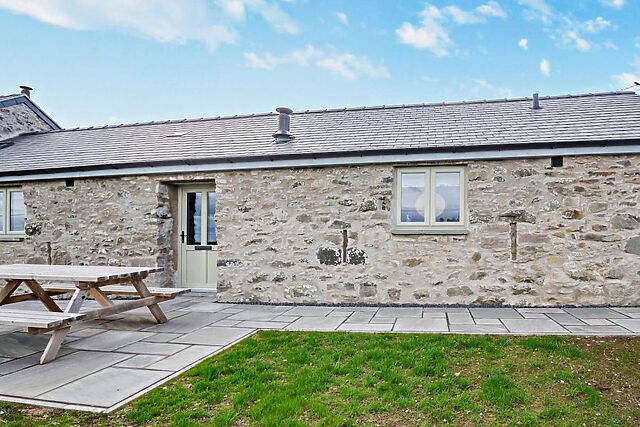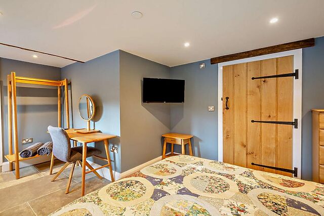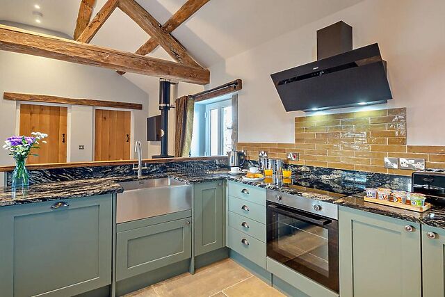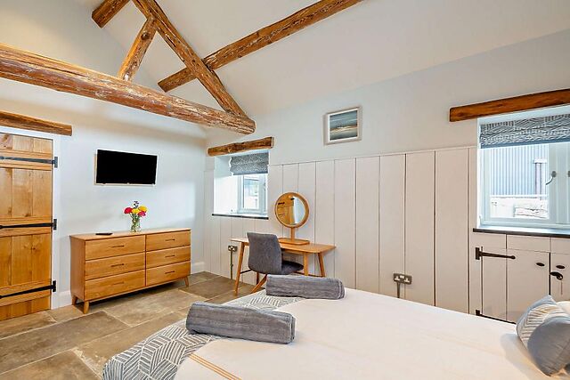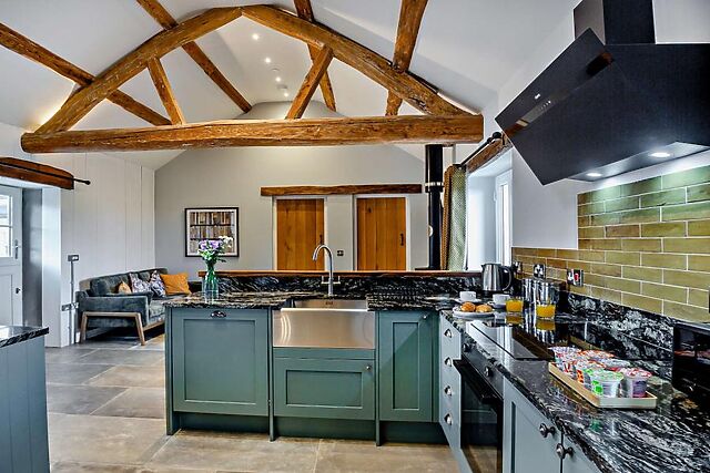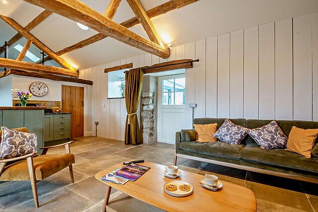 Once a cow shed, this barn has been lovingly converted into a stylish retreat. The open-plan living area has a high ceiling, exposed beams, stone walls and a warming wood burner for those chilly evenings in.