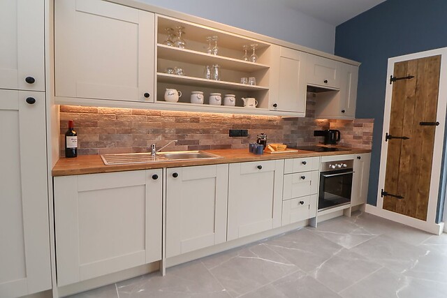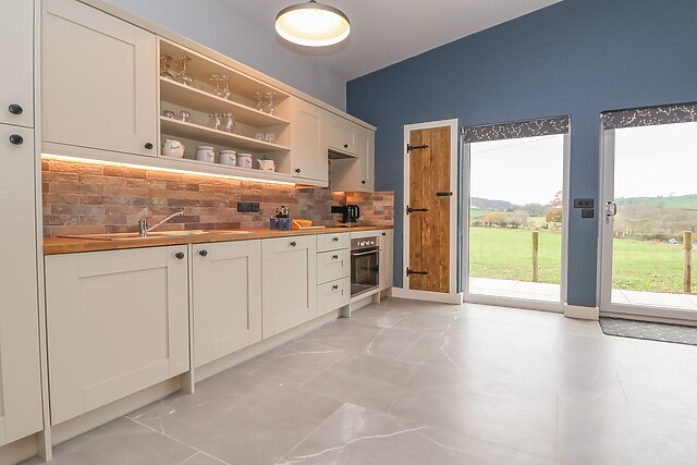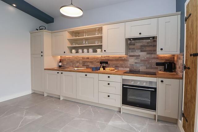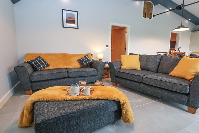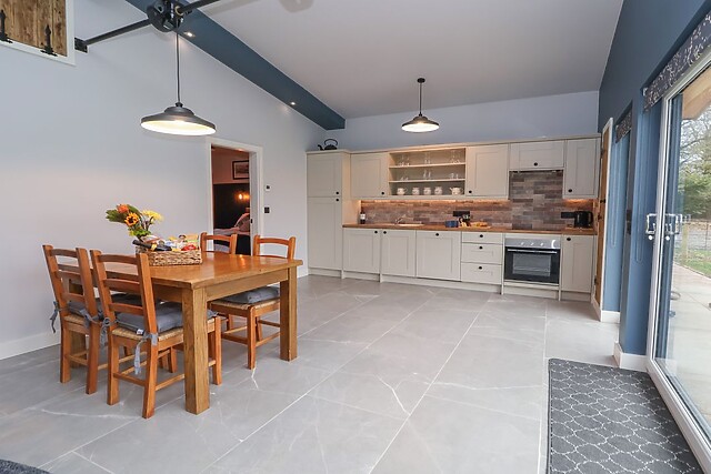 Inside your new single-storey abode, you will be greeted by a spacious open-plan area, thoughtfully laid out to include a kitchen, dining room, and sitting room. After arriving, take the weight off your feet and enjoy the glowing embers of the woodburning stove as you enjoy your favourite shows and films on the Smart TV.