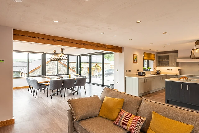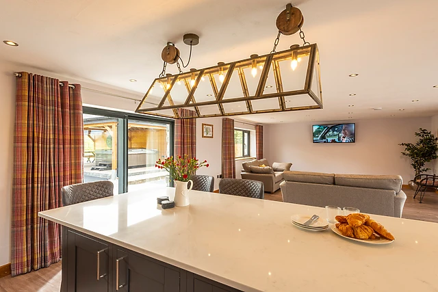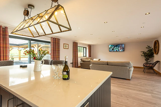 Spend your evening indoors within the light-filled open-plan living room, boasting an elegant kitchen space, which is certain to tempt you into a spot of home cooking, the breakfast bar making a great sociable spot to enjoy a glass of fizz whilst dinner simmers on the hob. Regroup with your loved ones at the bespoke oak-built dining table, where you can relish in raising a glass to a wonderful holiday and tucking to a delicious meal with the surrounding glass windows providing lovely views to admire.