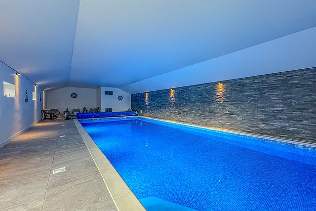 Yes, there is a private heated indoor swimming pool available for guests' exclusive use. The pool area includes changing rooms and offers a luxurious addition to the property's amenities.