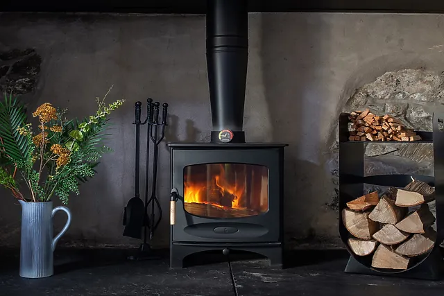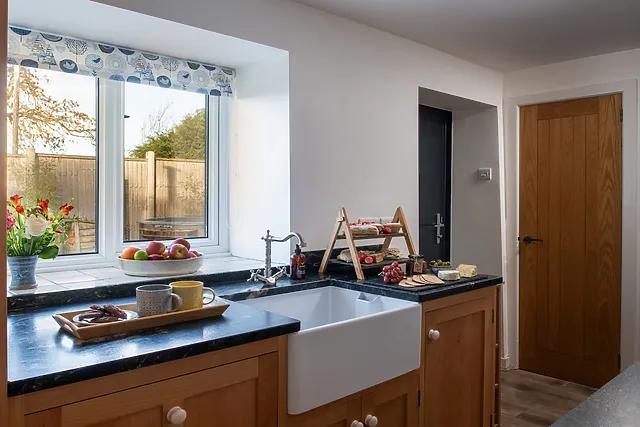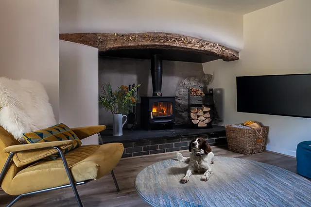 The living spaces exude rustic charm, with wooden beams and a wood burner set in an original inglenook fireplace, creating a cosy atmosphere for evenings in.