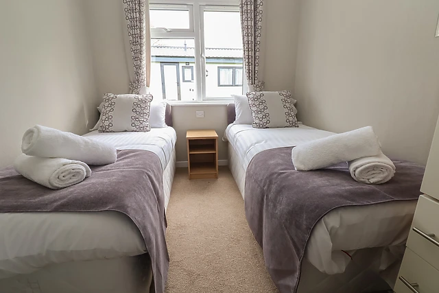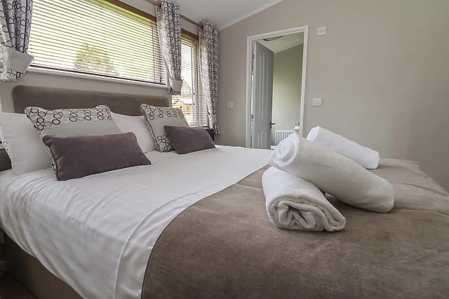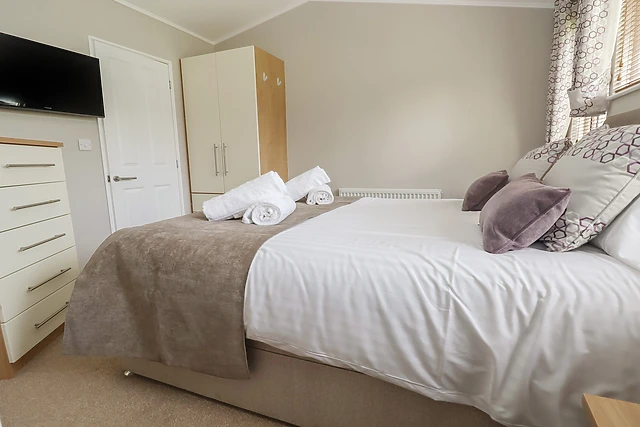 The fully-equipped kitchen boasts an electric double oven and gas hob, microwave, fridge freezer, and dishwasher, providing all the essentials for preparing delicious meals. The lodge offers two inviting bedrooms, including a double with a TV and en-suite shower room with walk-in shower, basin, and WC, as well as a twin with its own TV.