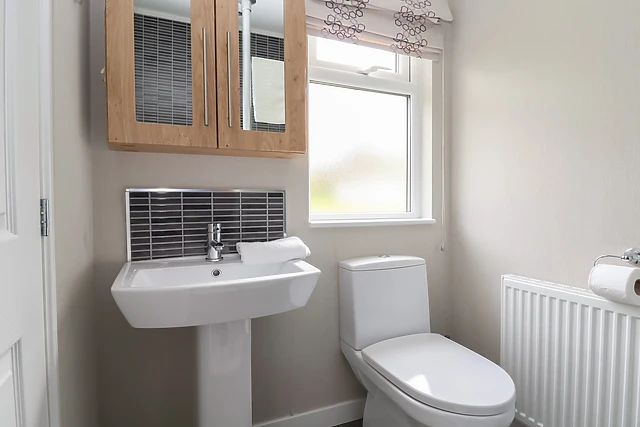 You'll also find a convenient family shower room with a walk-in shower, basin, and WC. For added relaxation, guests have shared on-site access to a hot tub, swimming pool, and sauna.
