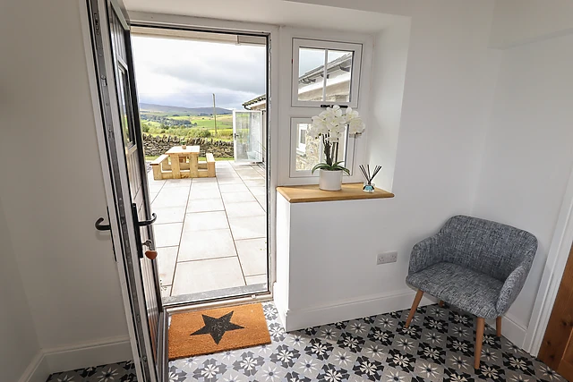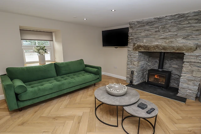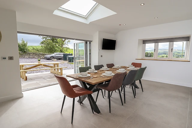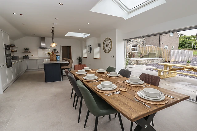 Afterwards, take the evening outdoors and relax on the patio seating beside the glass balustrades before the starry sky encourages you to enjoy a dip in the hot tub. Alternatively, the lounge offers two large sofas positioned in front of the woodburning stove and Smart TV, creating the perfect setup for movie nights.