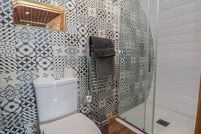 The separate shower room is stylishly fitted with attractive Mediterranean tiles, offering a little touch of luxury. Chances are anyone staying at Rhosydd will be a lover of the great outdoors so guests will be delighted with the outdoor space, which includes a fabulous covered area with a large hot tub, a prep kitchen, a woodburning stove, and a seating area and there’s even a TV so you can chill out in the evening while looking at the beautiful countryside and dark skies.