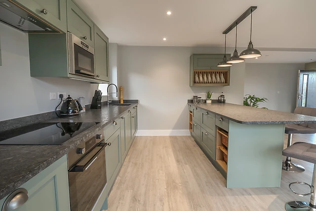 The property boasts an open-plan living space that exudes warmth and sophistication, complemented by a fully-equipped kitchen.
