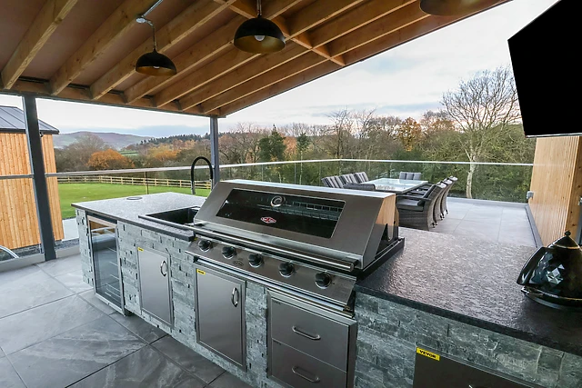 Step outside to a first-floor balcony and terrace, complete with an outdoor kitchen, gas barbecue, and dining area, all set against a backdrop of stunning natural beauty.