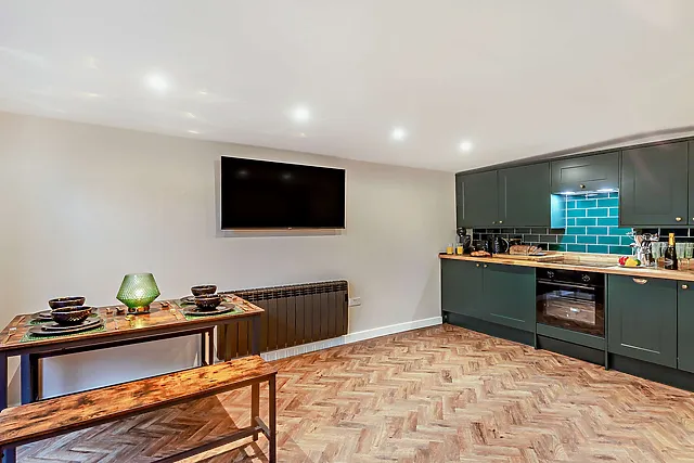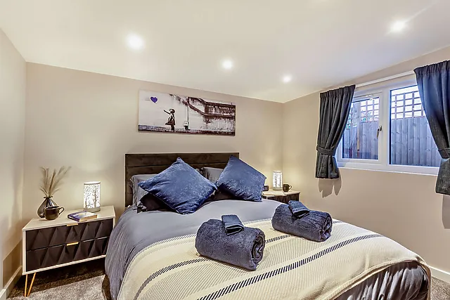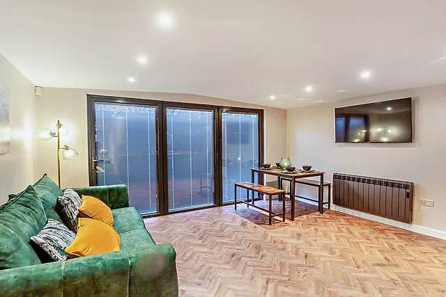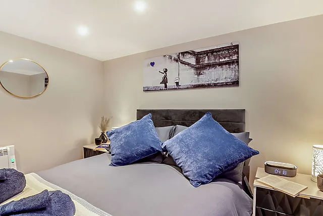 Here, you'll find a dining table for four and a comfortable sofa complemented by high-quality beanbags, perfect for cosy evenings in front of the Smart TV. The first stop along the hallway is a beautifully decorated double bedroom, offering a serene retreat for parents and couples.