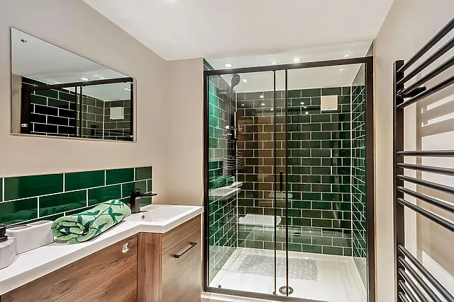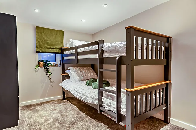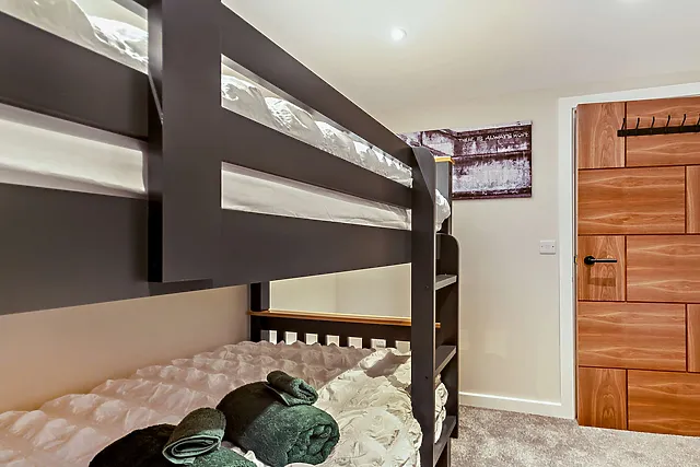 Further down the hall, you'll discover the modern family bathroom featuring a generously sized walk-in shower. The final bedroom, designed with children in mind, boasts bunk beds, a Smart TV, and a selection of games and Lego sets for endless entertainment.