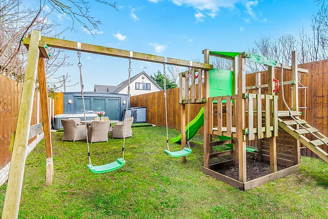 Bi-folding doors seamlessly connect the living area to the enclosed garden, where you can relax in the inviting hot tub, sizzle up a storm on the BBQ, and dine alfresco at the outdoor table and chairs. A play area at the bottom of the garden ensures endless fun for children, and for your furry friend, there's a convenient outside tap to wash off the day's adventures at the beach, along with a basket filled with blankets and treats to ensure their comfort.