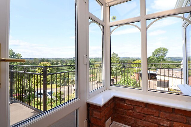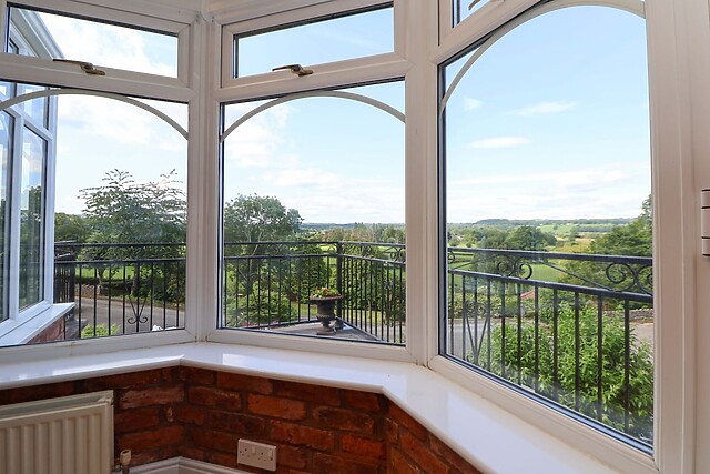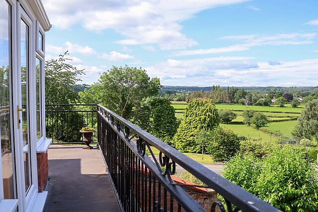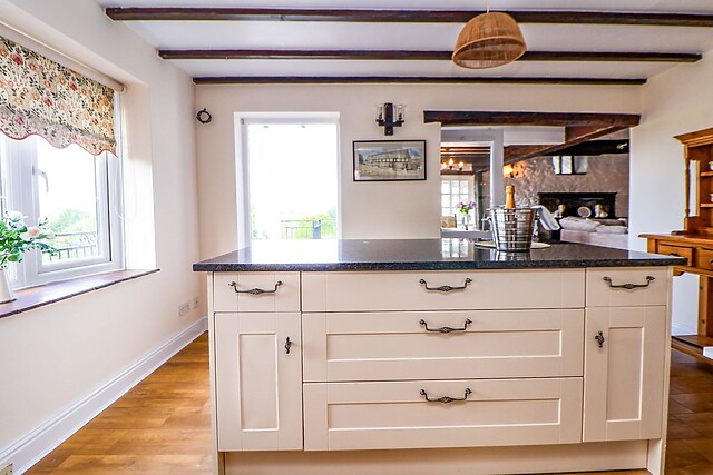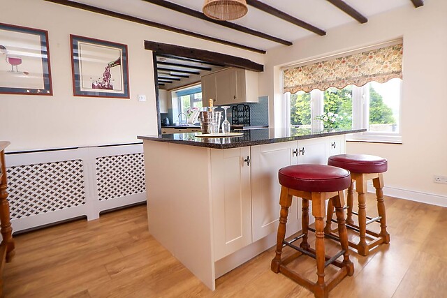 From here, you can access the conservatory, which features exposed brickwork and lovely countryside views, and opens out to a veranda for enjoying the fresh air with a book. The first floor also features a well-equipped kitchen with an oil-fired range cooker—perfect for preparing hearty group meals.