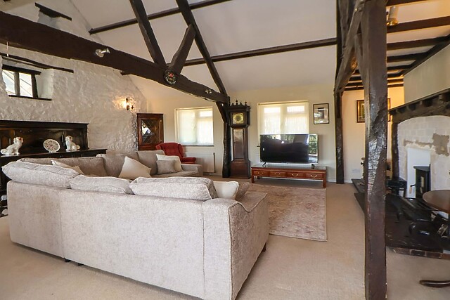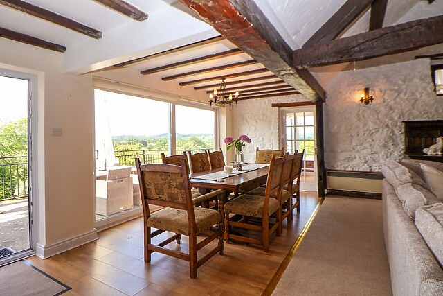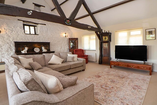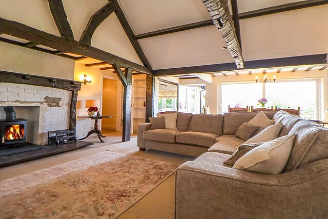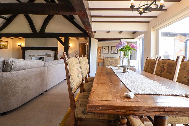 Step inside from the balcony into the first-floor living and dining area, where rustic white brick walls, exposed beams, a large corner sofa, and a dining table for eight create a warm and welcoming space. A woodburning stove and Smart TV complete the room.