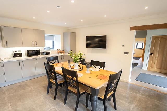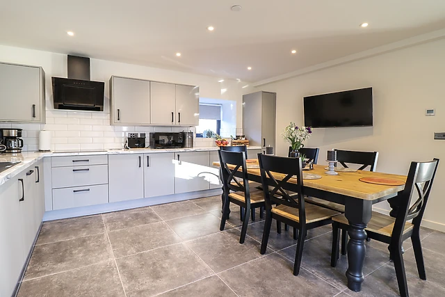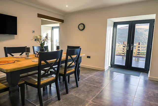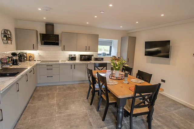 After a hearty meal, why not head out to the private enclosed patio where your canine companion can stretch their legs as you indulge in a dip in the hot tub whilst soaking up the panoramic countryside views on offer. Continuing through the ground-floor, you will find a cloakroom, ideal for those quick freshen ups, and a well-presented king-size bedroom with Smart TV and en-suite shower room, perfect for those with limited mobility.