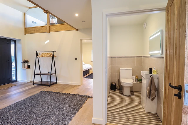 Climb the stairs up to the amazing gallery walkway, where you can access the first-floor sitting room which features large A-frame floor-to-ceiling windows showcasing the lush rolling countryside, which you can admire as you snuggle up on the plush sofa and select your favourite film from the Smart TV. When sleep calls, there is also the option of a beautifully presented bedroom on the first floor, a king-size with an opulent free-standing bath surrounded by feature lighting, en-suite shower room and Smart TV, a haven to return to after a day of exploring.