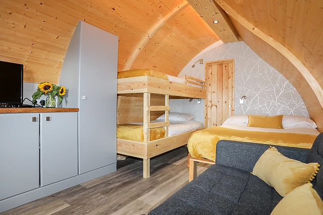 The pod features a contemporary kitchen/diner with all the necessary appliances to whip up a delicious meal, and a cosy bedroom/seating area with a double bed, bunk beds, sofa, and Freesat TV for those family movie nights.