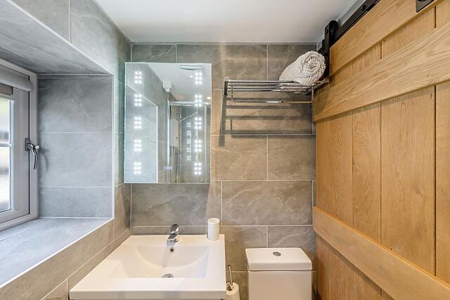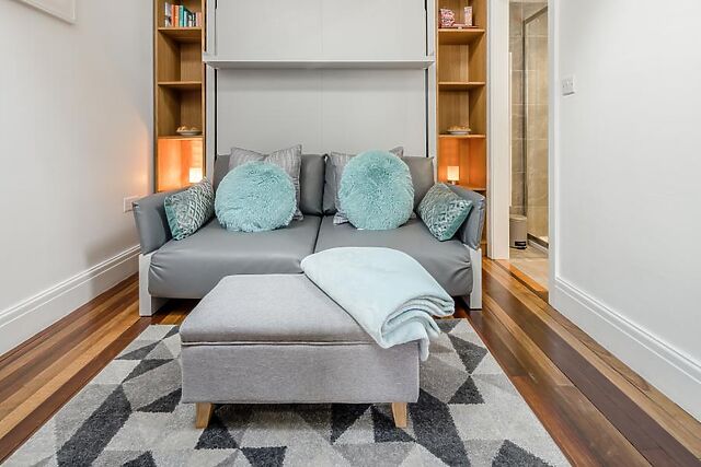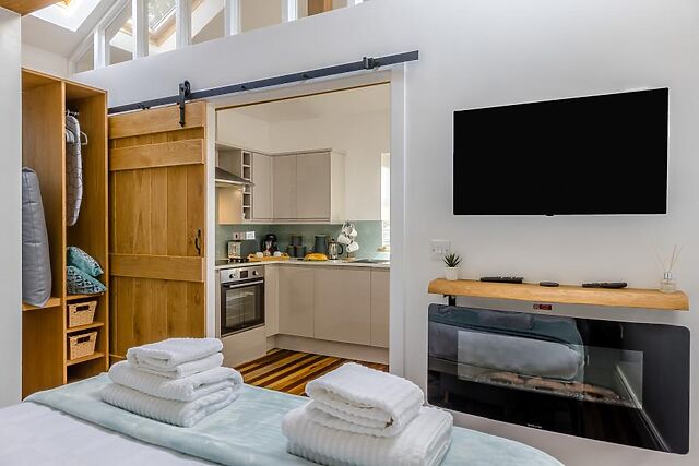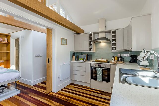High ceilings and exposed oak beams with a glass partition feature along the upper length of the wall between the living area and the kitchen make it both light and cosy. Sitting area consists of a sofa which forms part of a cleverly engineered Italian designed wall bed with one handed operation to reveal a king size memory foam bed.