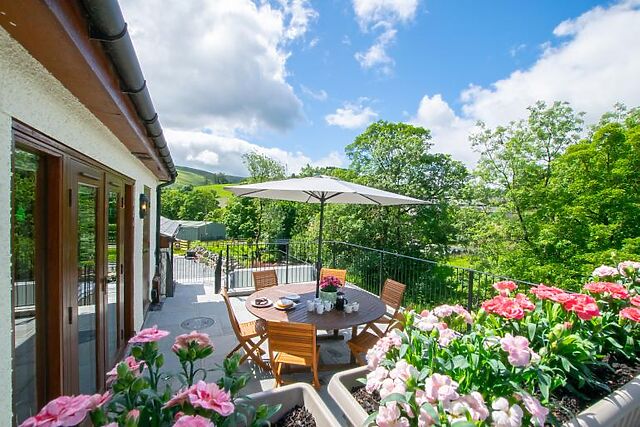 Outside, the elevated rear patio offers breathtaking views over the river and mountains. Equipped with a hot tub, garden furniture, and a BBQ, it's a fantastic spot to unwind during the warmer months.