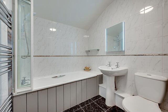 There are two bathrooms, one with a shower over the bath and another with a walk-in shower for easy access.