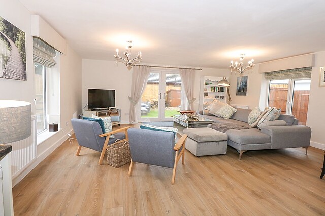 The living area has plenty of room for relaxation, you can lounge on the L-shaped sofa or flick on the TV. The patio doors open to the pleasing enclosed garden.
