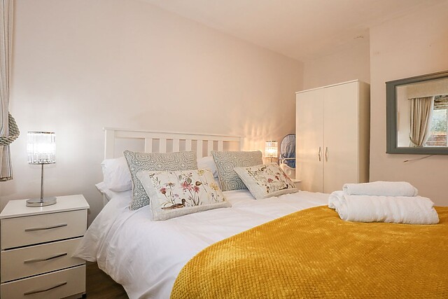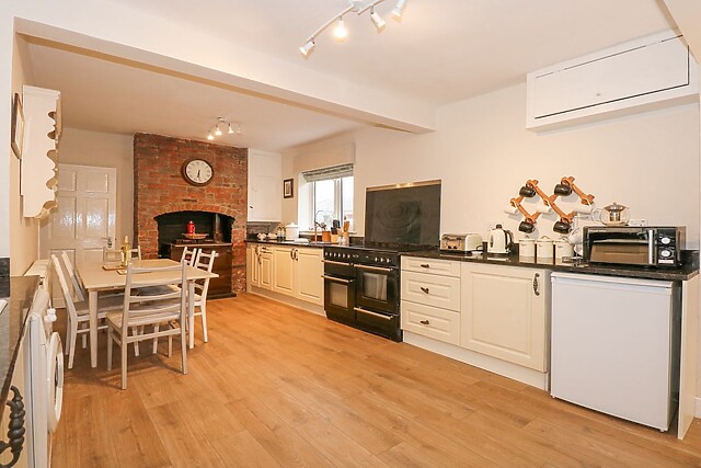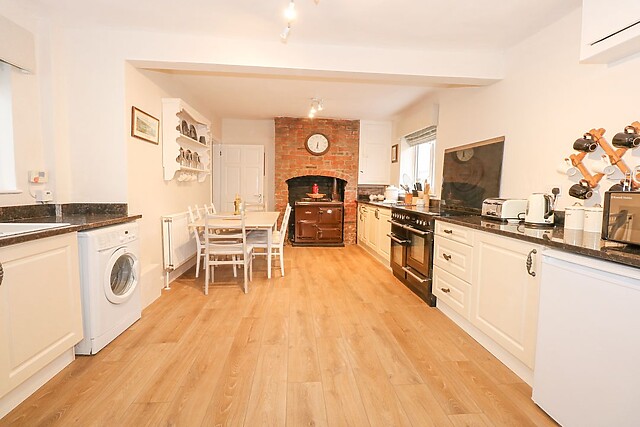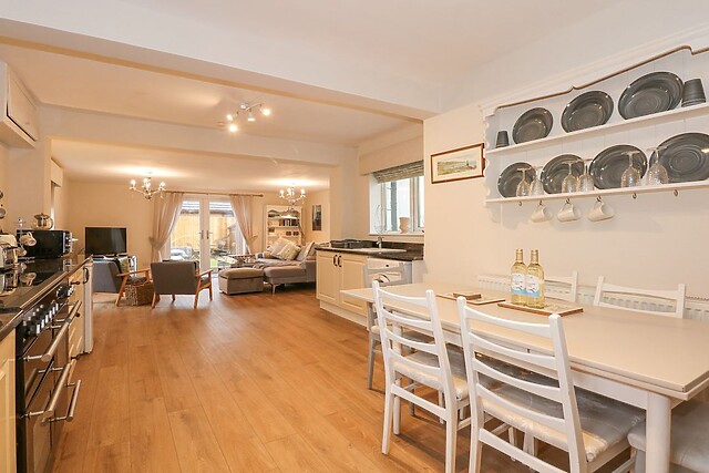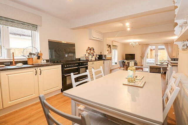 The living space is clean-cut and welcoming containing the kitchen with a display AGA cooker, sitting within a classically bricked fireplace. There is a double oven to whip up a feast and a dining area for everyone to catch up on the day's events.