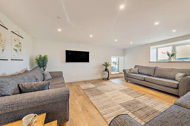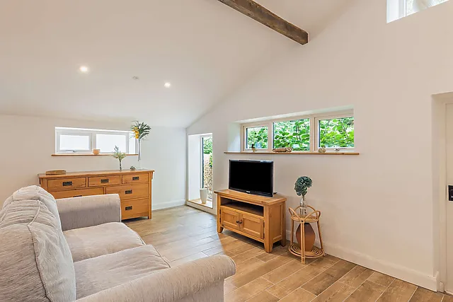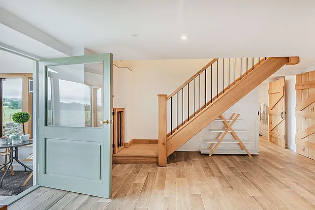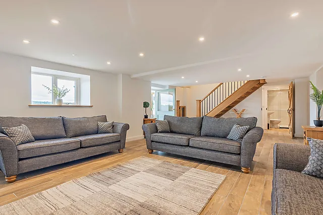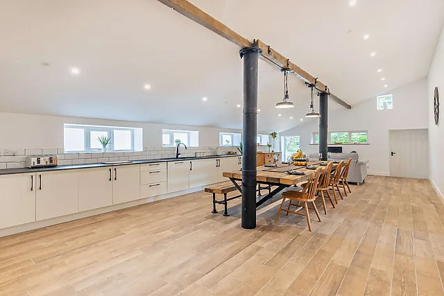 Indulge in the ultimate relaxation with the enclosed wood-fired hot tub, set against the backdrop of panoramic countryside views. The barn's spacious interior boasts exposed beams and vaulted ceilings, while underfloor heating adds a touch of warmth and comfort.