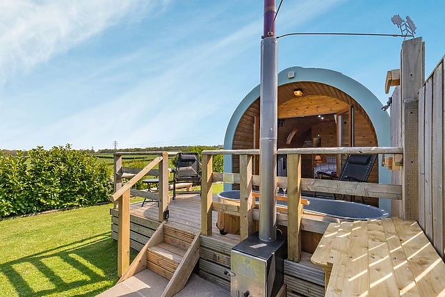 Concluding this unusual holiday accommodation is the shower room, boasting a walk-in shower, a basin and WC. Continuing to impress is the private decked area, where you can look forward to dipping into the wood-fired hot tub built in just for you both to enjoy on a warm mid-summer evening.
