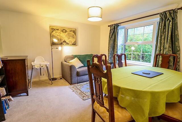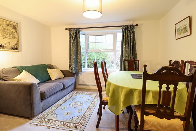 Enjoy your meals in the inviting dining area with seating for six, offering a perfect space for gathering, dining, and unwinding together. The sitting room is a blend of character and contemporary, with a mix of furniture that offers a glimpse into the property's historic past.