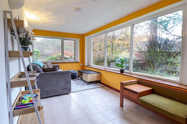 Outside, the property extends its charm with a lush lawn surrounded by mature trees, creating a peaceful, secluded retreat where you can relax and listen to the gentle chirping of birds. The enclosed rear courtyard adds to the sense of privacy, featuring comfortable outdoor furniture and a hot tub, providing the perfect spot to unwind while immersed in the serene forest backdrop.