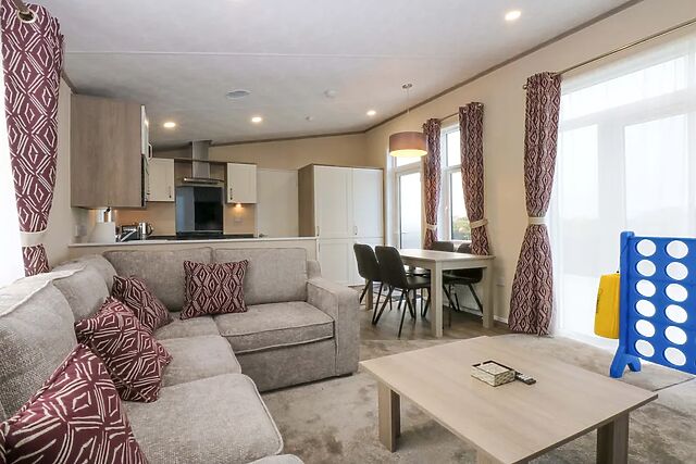 Step into the open-plan living area, where the kitchen comes equipped with the everyday essentials, making mealtimes easy whether you’re rustling up breakfast or putting together something heartier after a long day out. The dining table brings everyone together, while the sitting area, with its electric fire and TV, adds a warm backdrop for slow evenings and early starts alike.