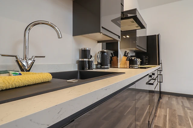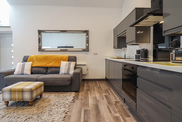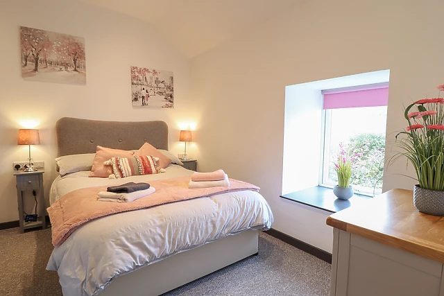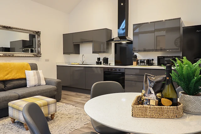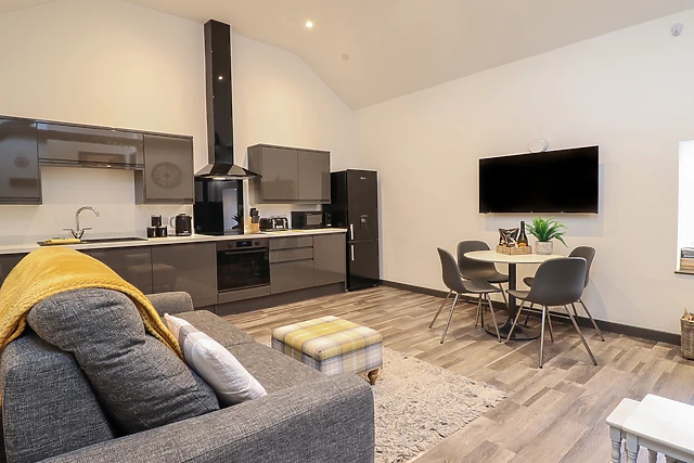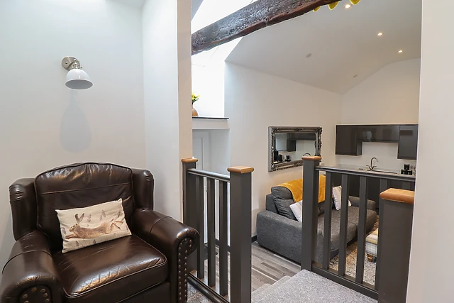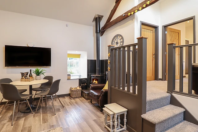 Travel through the small holding and park up off-road, taking in the tranquillity of your new surroundings. Be welcomed by the open-plan living space, complete with a sleek, well-equipped kitchen, dining space for four guests with a vaulted, beamed ceiling above, and a sofa.