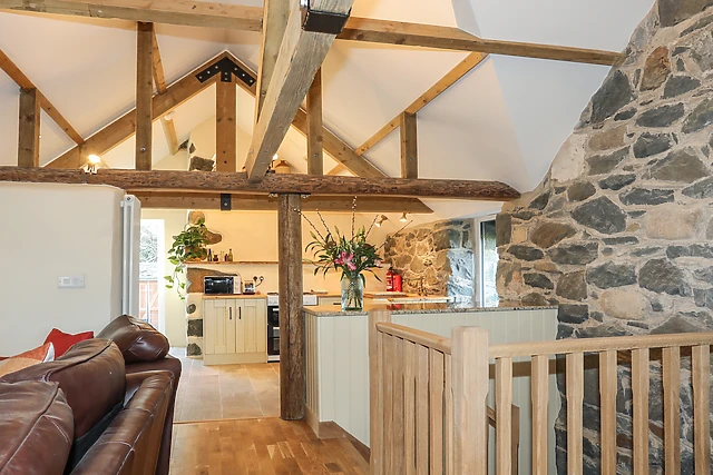 There is also a pretty twin and a separate shower room for your refreshment. The living spaces can be found on the first floor, and are open-plan, sporting a tastefully outfitted kitchen with exposed stone walls and ample amenities to cater to your culinary needs.