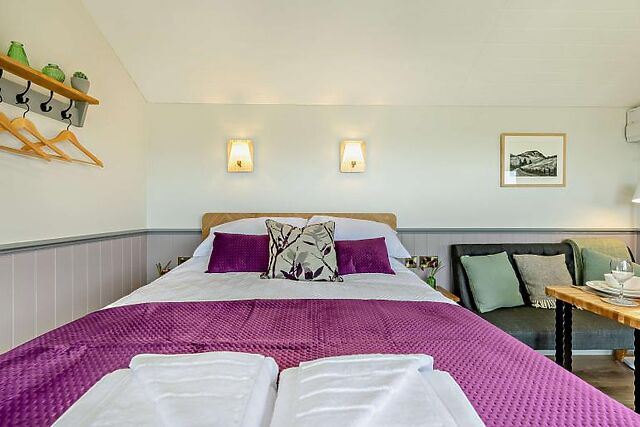 The kitchen is well-equipped for preparing meals, and the king-size bed ensures a restful night's sleep. The shower room is modern and convenient.