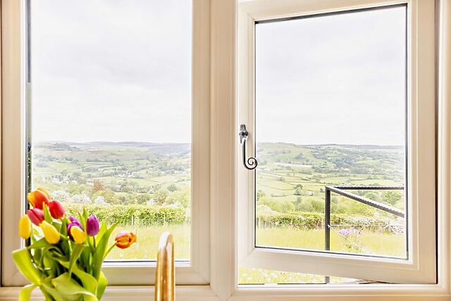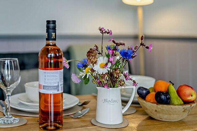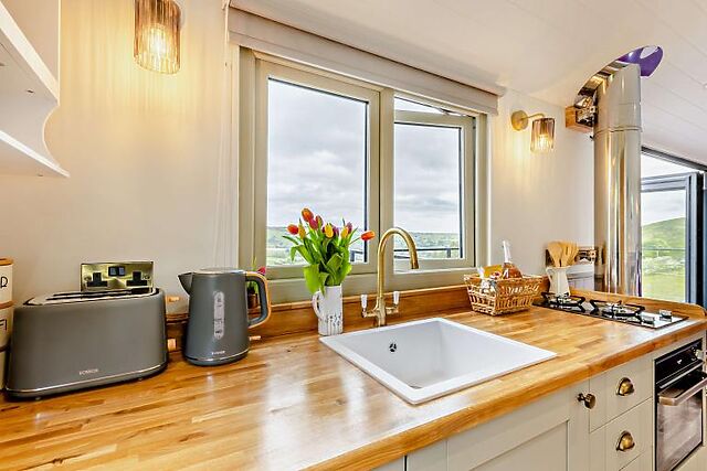 Step inside to find an open-plan living area with a wood burner, ideal for relaxing evenings.